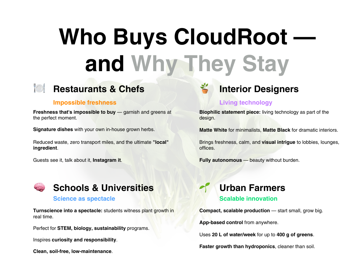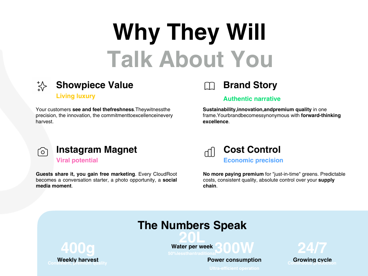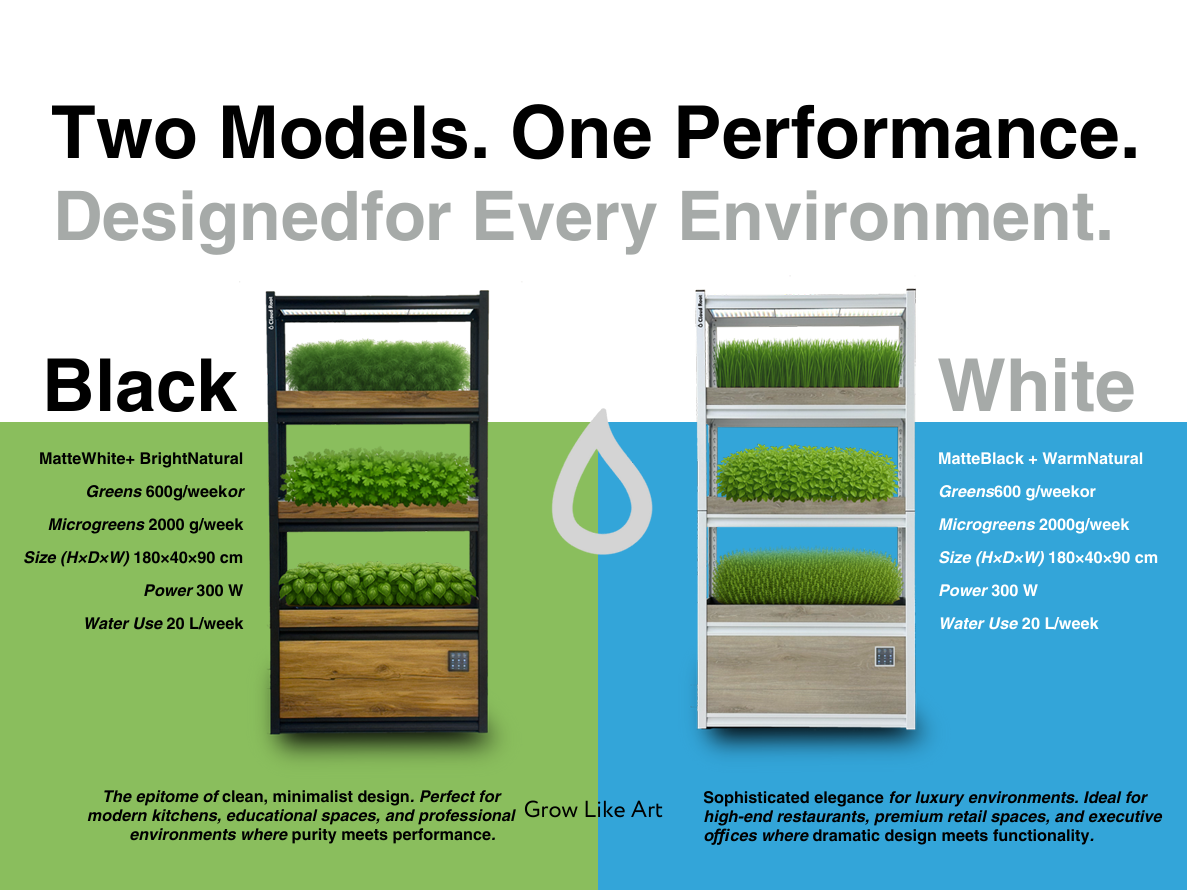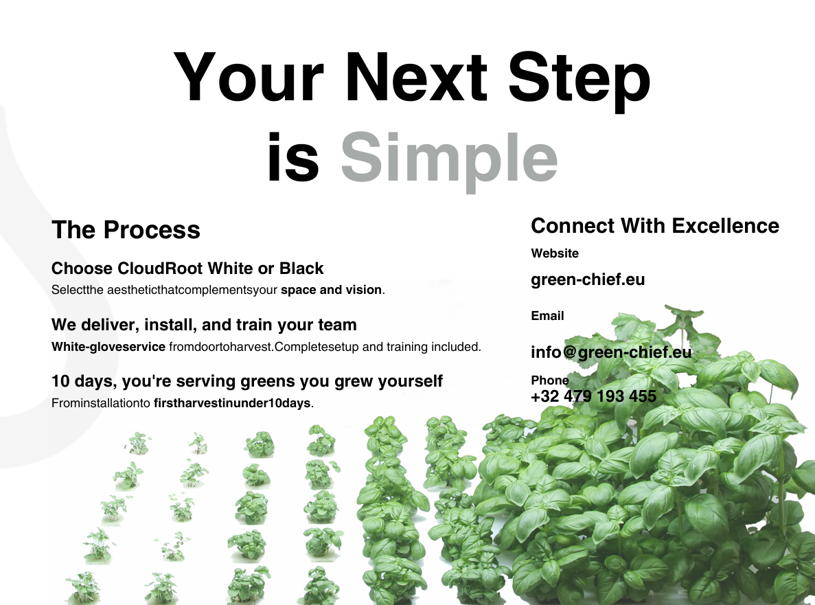 CloudRoot is een premium fogponic groeisysteem dat elke binnenruimte verandert in een levende, productieve tuin. Met ultrasone nevel, geoptimaliseerde LED-verlichting en slimme app-bediening produceert het tot 600 g bladgroenten of 2.000 g microgroenten per week – midden in uw restaurant, klaslokaal, lobby of kantoor. Ontworpen als showpiece én als werktuig, verkrijgbaar in Matte Black en Matte White zodat het in elk hoogwaardig interieur past.