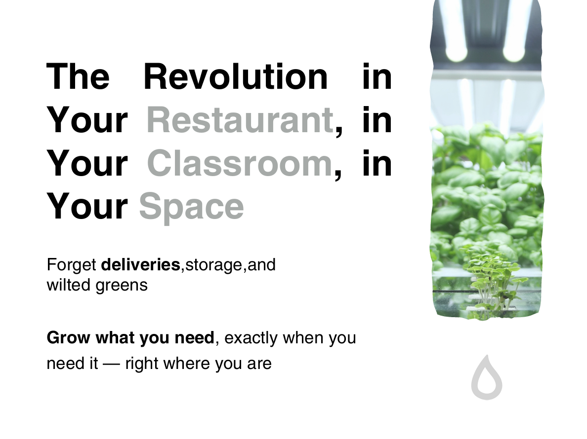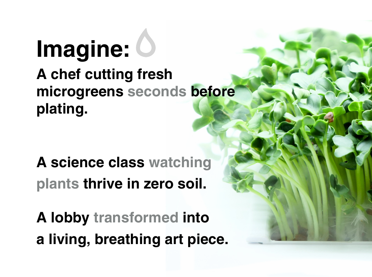 Serveer kruiden en microgroenten die u zelf hebt geteeld, precies in het stadium en de kwaliteit die u wilt. Verminder verspilling en afhankelijkheid van leveringen en voeg een opvallend levend element toe aan de eetzaal of open keuken.