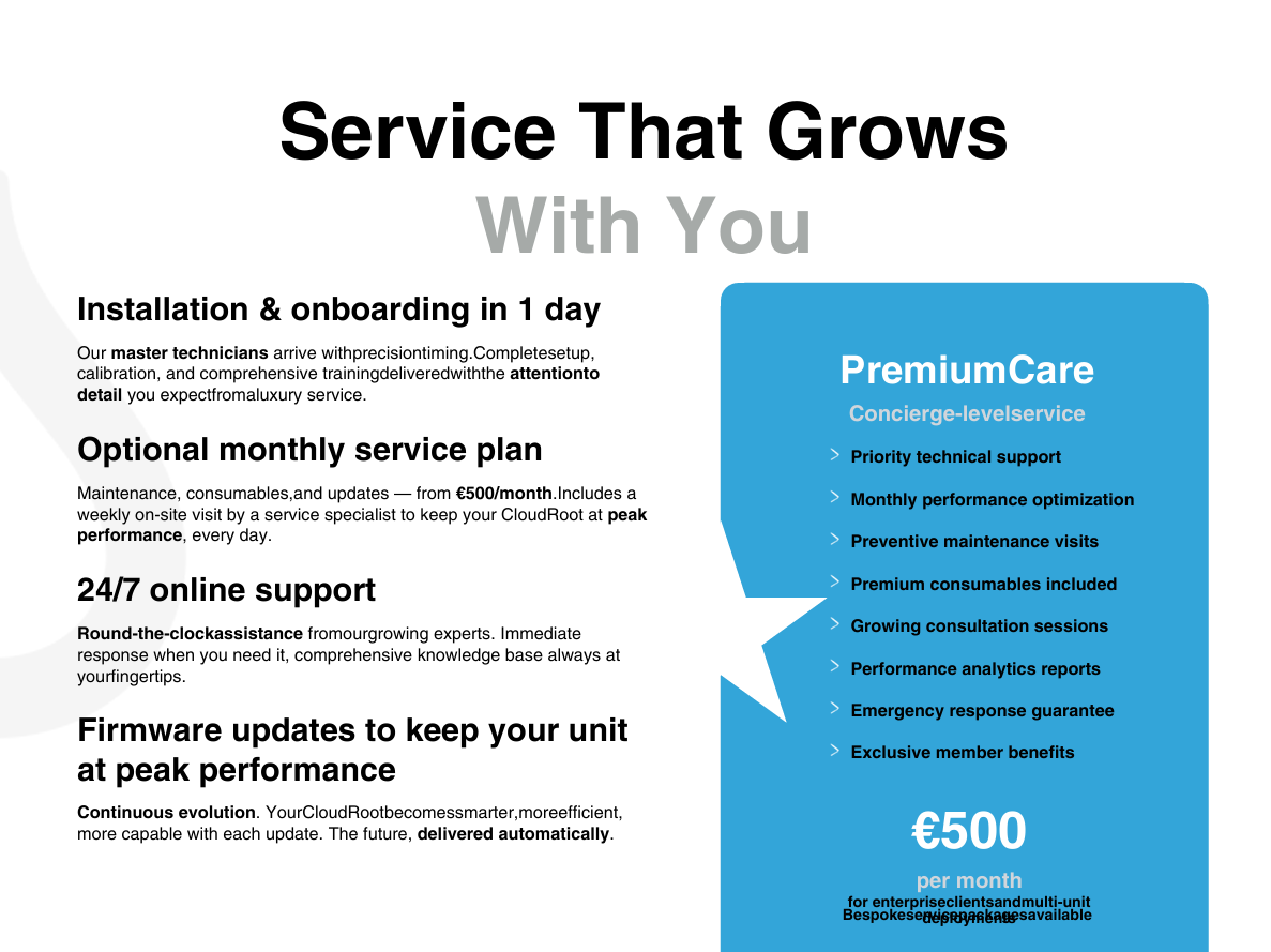 Begin met één unit en breid uit. De compacte voetafdruk, het lage waterverbruik en bediening via de app maken het ideaal als testplatform of modulaire productiecel.
